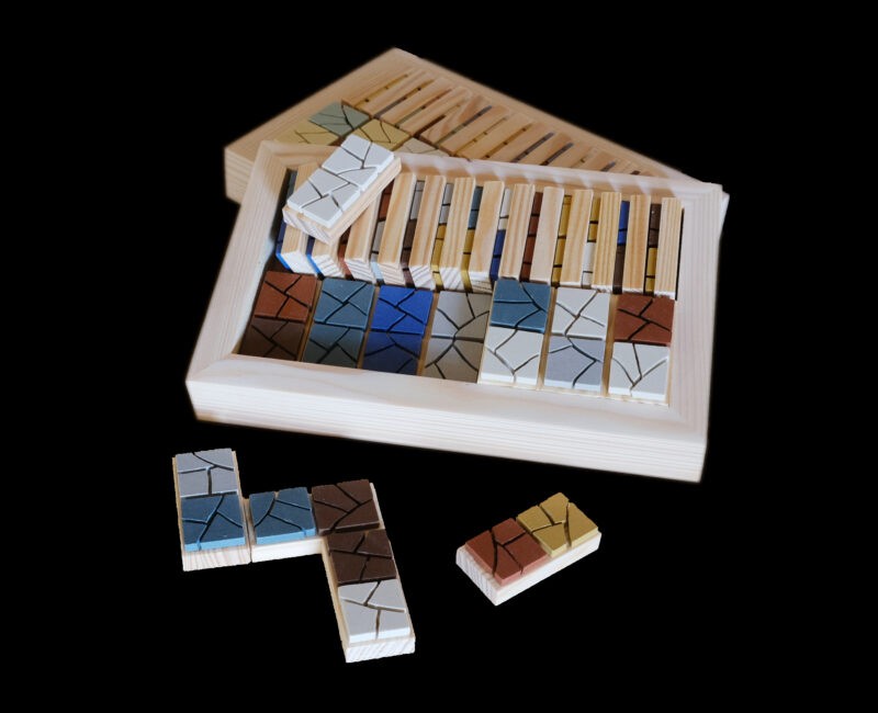 Jeu de dominos en grès cérame, revisité pour jouer avec 7 couleurs. Le jeu est livré dans une boîte en bois fabriquée dans mon atelier et accompagné d’une pochette en tissu. Dans cette version, chaque joueur pose ses dominos à plat sur la table : en voyant le jeu de vos adversaires, vous devez adapter votre stratégie ! La pioche se fait dans le sac en tissu. Taille en cm : 20 x 13 x 3,5